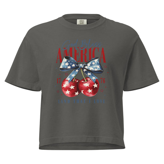 Cherry God Bless America 4th of July Patriotic Women’s heavyweight boxy tee